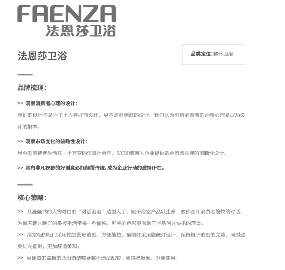 八点半品牌设计以符号定义产品,产品符号定义人,产品即符号,产品研发即创造购买理由的产品设计理念,通过创新设计产品符号,设计产品包装让产品自己会说话,以及创意营销打造品牌、产品和营销场景体验三体合一,给予顾客难以忘怀的极致体验,为乐华陶瓷洁具旗下高端品牌法恩莎,设计全新产品及产品画册。